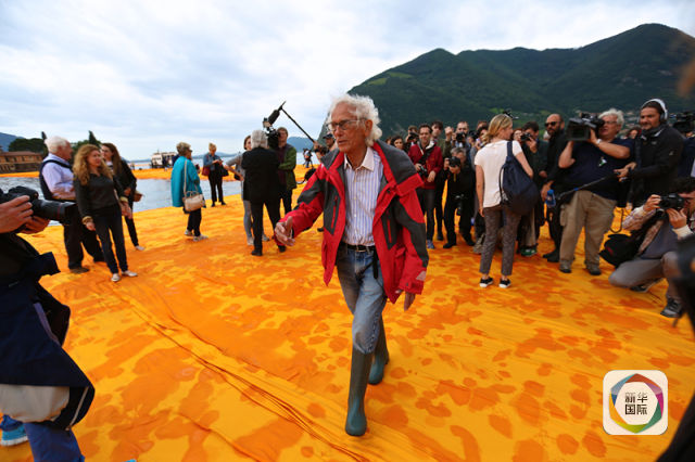 6月16日,在意大利伊塞奥湖,艺术家赫里斯托走在“浮桥”装置艺术上。