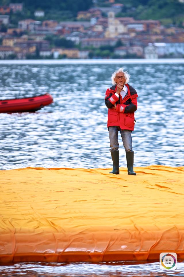 6月16日,在意大利伊塞奥湖,艺术家赫里斯托站在“浮桥”装置艺术上。
