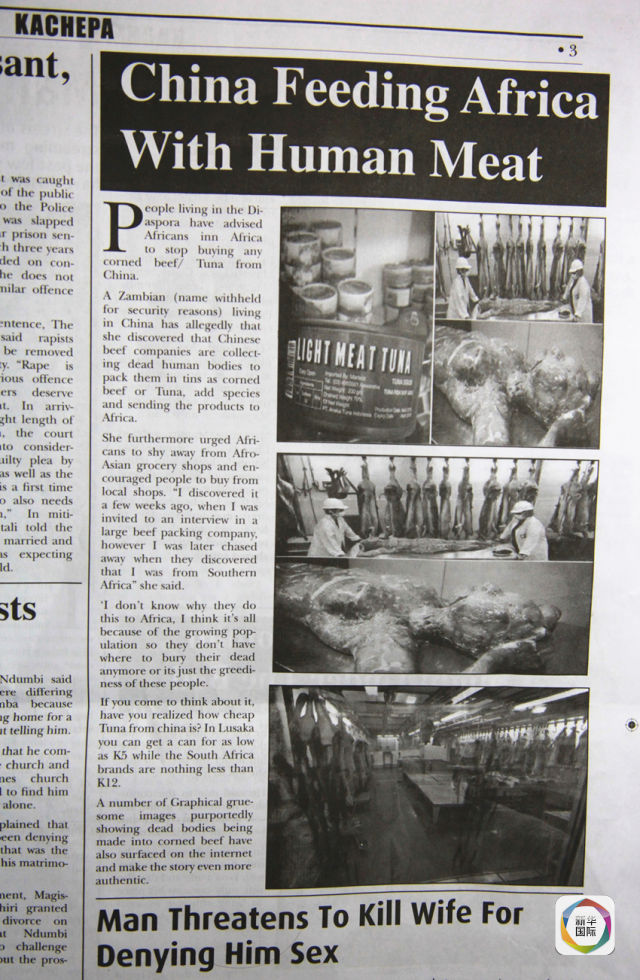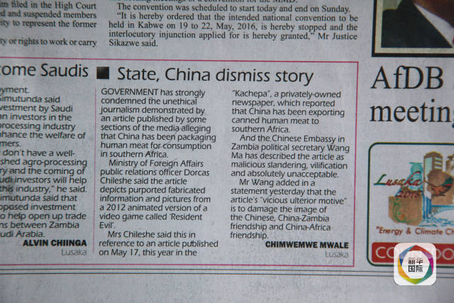 文中说道,赞比亚政府强烈谴责不道德的媒体刊发关于中国向南部非洲销售人肉的文章。赞比亚外交部公共关系官员多卡斯说,今年5月17日,一家私营报纸“KACHEPA”(意为八卦、传言)刊登了这篇不实文章,宣称中国将人肉罐头出口到南部非洲。