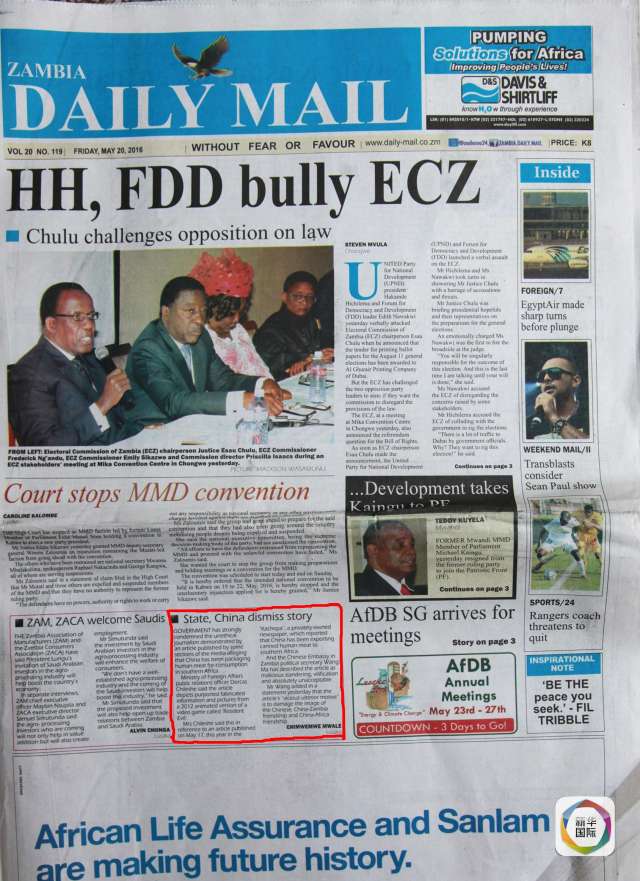(5月20日,赞比亚《每日国家报》辟谣文章)
