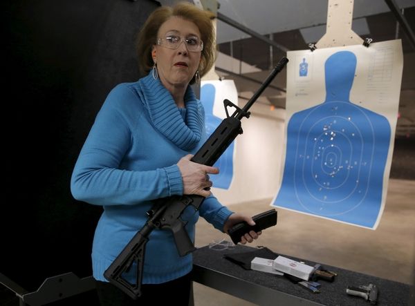 2016年1月25日,美国艾奥瓦州海厄瓦萨市,一名老年妇女在枪支商店手持AR-15步枪。