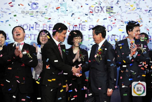 2016年4月25日,新加坡总理公署部长陈振声(中间左)与中国建设银行董事长王洪章(中间右)在新加坡举行的合作签约仪式上握手。 新华社发(邓智炜摄)