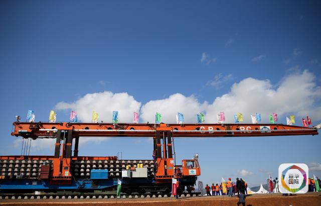 这是2016年5月28日在肯尼亚马库埃尼附近的蒙内铁路第七标段拍摄的铺轨作业现场。 新华社记者 潘思危