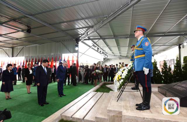 当地时间6月17日下午,刚刚抵达贝尔格莱德开始对塞尔维亚进行国事访问的国家主席习近平和夫人彭丽媛,第一场活动就是前往中国驻南联盟被炸使馆旧址,凭吊在使馆被炸事件中英勇牺牲的邵云环、许杏虎和朱颖3位烈士。新华社记者饶爱民摄