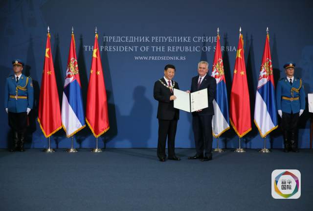 6月18日,国家主席习近平在贝尔格莱德同塞尔维亚总统尼科利奇举行会谈。会谈后,尼科利奇向习近平授予塞尔维亚最高级别勋章“共和国一级荣誉勋章”,感谢习近平为中塞关系发展作出的杰出贡献。新华社记者兰红光摄