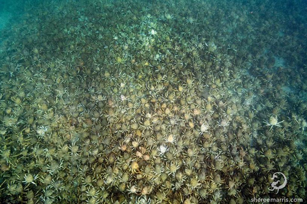 据英国《每日邮报》6月16日报道,水生科学家希尔 马里斯日前在墨尔本的菲利普港湾拍摄到了令人瞠目结舌的一幕。成千上万只蜘蛛蟹齐聚海底,开启了一年一度的大迁徙。