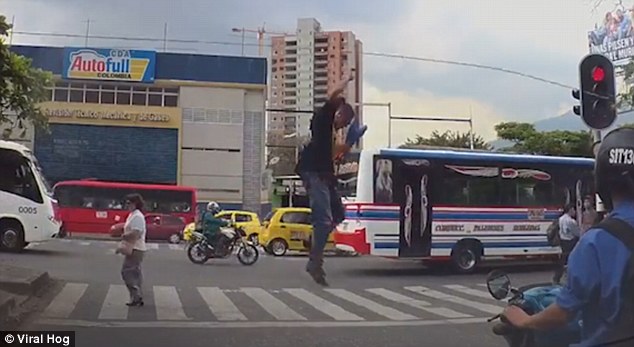 哥伦比亚男子街头等红灯时拉绳表演杂耍吸人眼球(图)