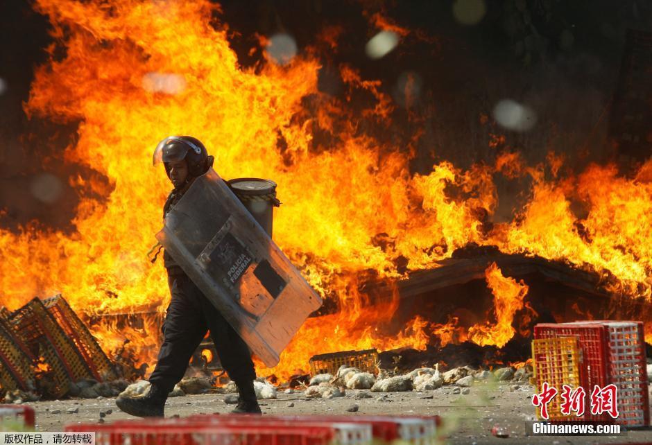抗议活动现场,一名防暴警察从燃烧的火堆前走过。