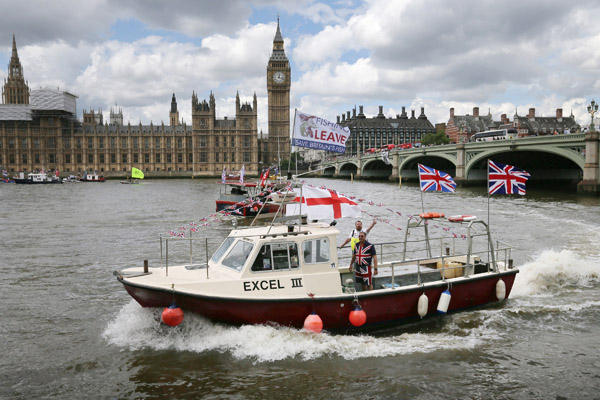 6月15日,“脱欧派”渔船船队在伦敦泰晤士河上参加造势活动。新华社发 蒂姆·爱尔兰摄