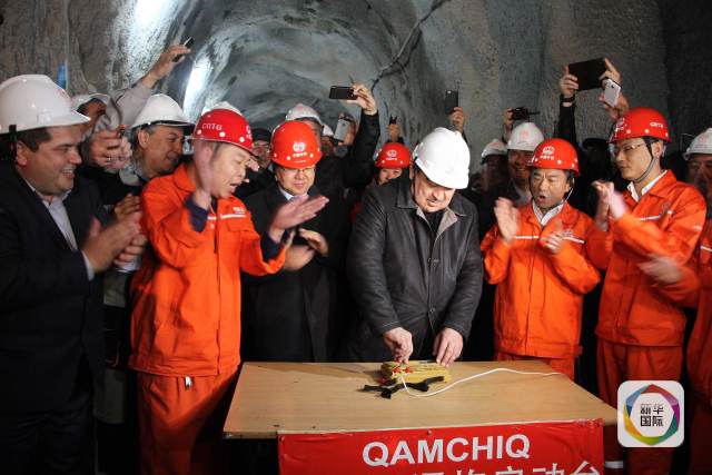 2016年2月27日,在乌兹别克斯坦安格连-帕普铁路卡姆奇克隧道进口,乌国家铁路公司主席拉马托夫(前右三)和中国驻乌兹别克斯坦大使孙立杰(前左三)共同出席贯通仪式。由中铁隧道集团承建的安格连-帕普铁路卡姆奇克隧道于今年2月底顺利贯通,该隧道段是安格连-帕普铁路全线的咽喉要道,被称为“中亚第一长隧道”。新华社记者沙达提摄