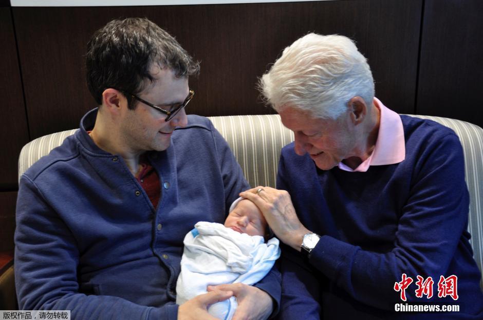 当地时间2016年6月20日消息,美国纽约,美国前总统克林顿与现任民主党总统参选人希拉里夫妻俩18日喜迎第2个外孙,独生女切尔西在推特宣布儿子诞生喜悦,并将孩子命名为“艾丹·克林顿·梅兹文斯基(Aidan Clinton Mezvinsky)”。图为克林顿与女婿抱着外孙。