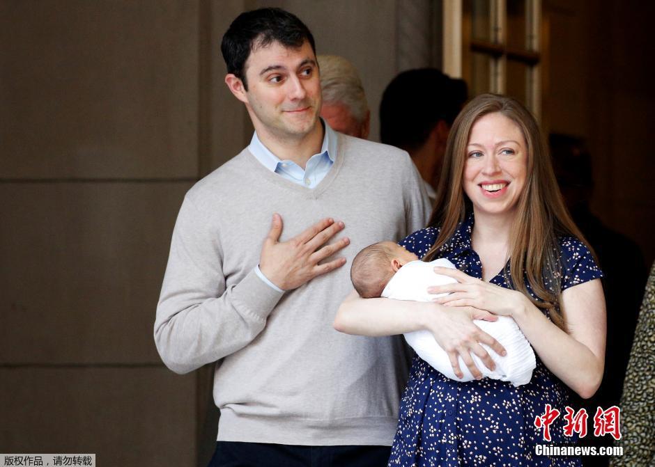 当地时间2016年6月20日消息,美国纽约,美国前总统克林顿与现任民主党总统参选人希拉里夫妻俩18日喜迎第2个外孙,独生女切尔西在推特宣布儿子诞生喜悦,并将孩子命名为“艾丹·克林顿·梅兹文斯基(Aidan Clinton Mezvinsky)”。图为6月20日切尔西抱爱子走出医院。