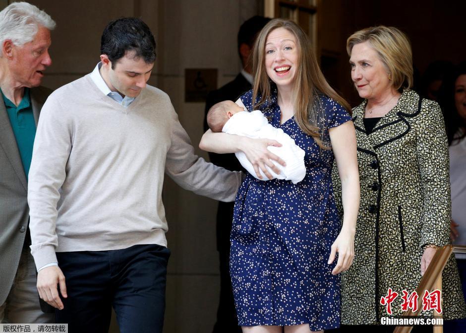 当地时间2016年6月20日消息,美国纽约,美国前总统克林顿与现任民主党总统参选人希拉里夫妻俩18日喜迎第2个外孙,独生女切尔西在推特宣布儿子诞生喜悦,并将孩子命名为“艾丹·克林顿·梅兹文斯基(Aidan Clinton Mezvinsky)”。图为6月20日切尔西抱爱子走出医院。