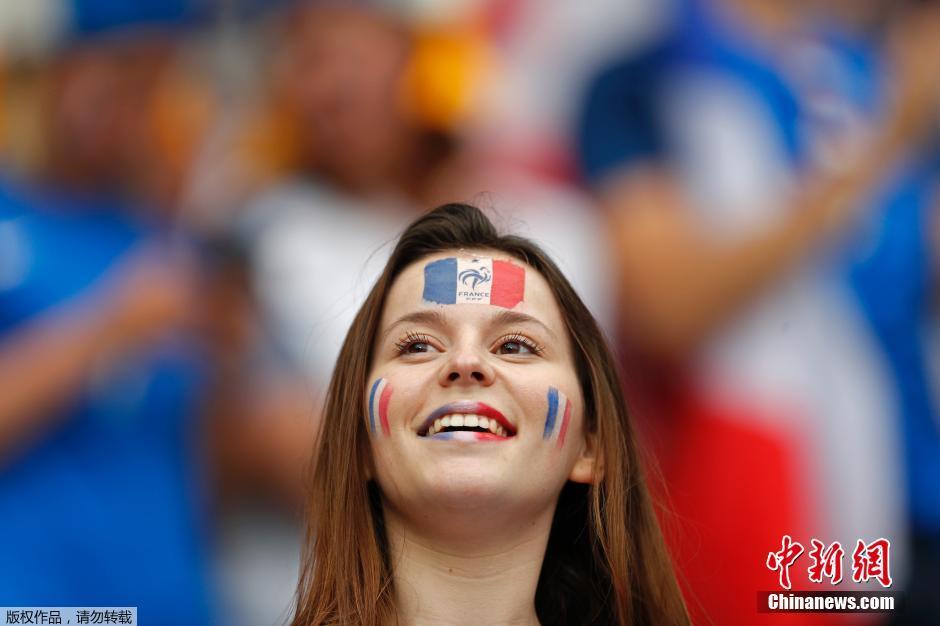一名法国队女球迷面带微笑。主队战绩不错,东道主球迷当然有舒展笑颜的理由。