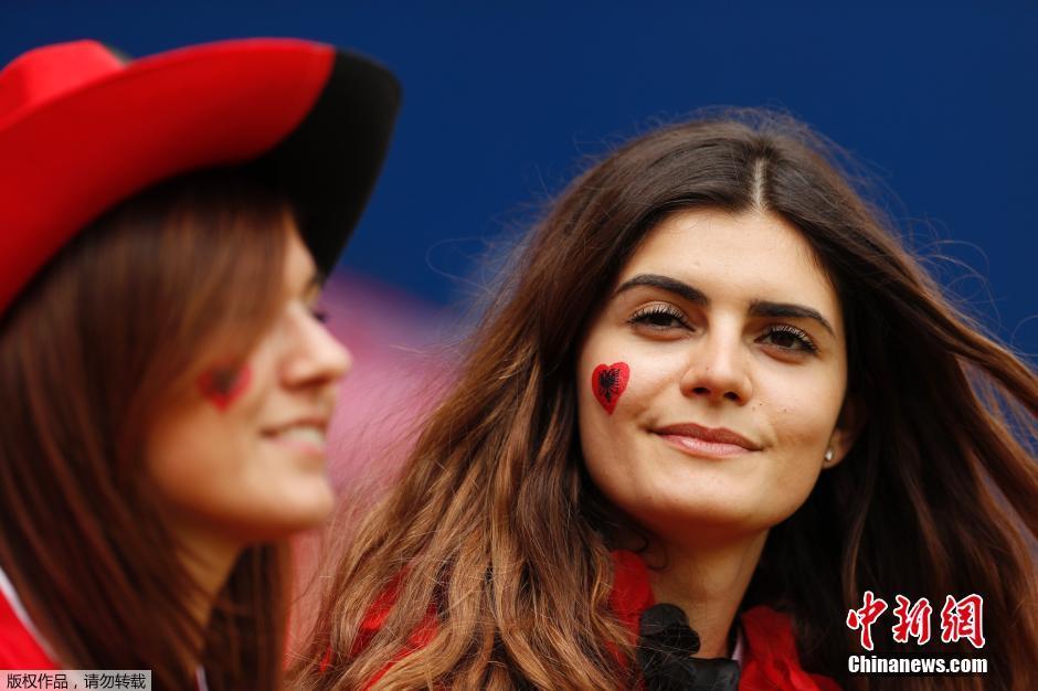 阿尔巴尼亚在参赛的24支球队里名头算不上大,但是他们的球迷不这么想。这位女球迷将国旗印在脸颊,表明了自己的态度。