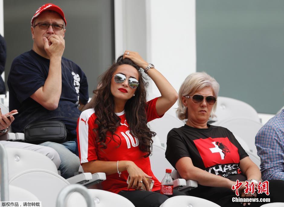 这位身份特殊的球迷,是瑞士队球员扎卡的太太,她身旁则是扎卡的母亲。扎卡两兄弟一位效力瑞士,一位效力阿尔巴尼亚,母亲身上各自一半的国旗拼图,表明了自己两边都支持。