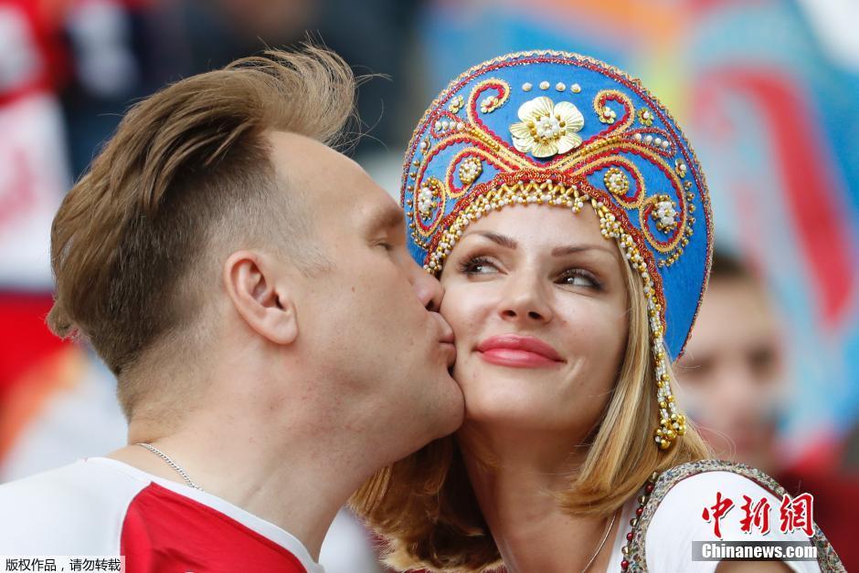 一对俄罗斯恋人来到了球场秀恩爱,亲亲的一个吻,表明我们不光会打架,还能走甜美路线。