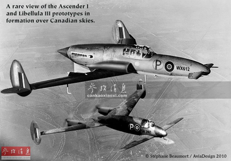 M.39B实际是作为一种喷气式高速轰炸机的验证机而制造的,但最终由于设计过于超前,最终未能投产,仅生产了一架原型机。本图是一张比较罕见的照片,在“蜻蜓”III改进型轰炸机之上飞行的是“升腾者”高速战斗机,两者都是英国航空工业20世纪40年代的“超前代表”。