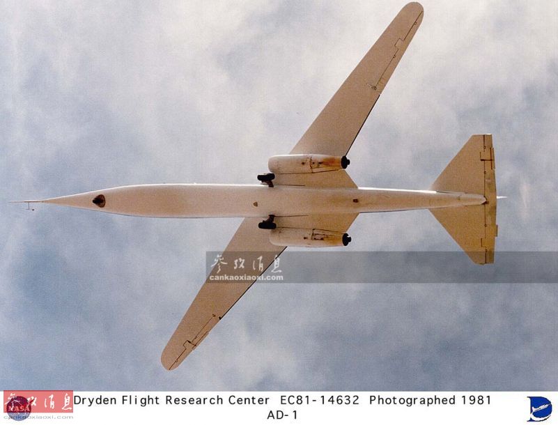 与传统布局飞机相比,斜翼机具有耗油低、航程远的优点。AD-1在试飞中曾达到过每小时322千米的最大平飞速度。图为仰视角度拍摄的AD-1斜翼机试飞图,摄于1981年。