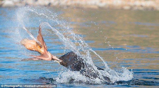 海豹捕食章鱼瞬间 拽出水面撕咬(组图)
