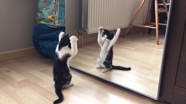 萌翻!小花猫照镜子跟自己打招呼惹人喜爱(组图)