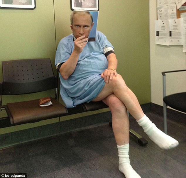 还有一张照片中的视错觉更是恶搞俄罗斯总统普京。一名前往医院探病的中年男子脚上穿着一双白色长筒袜,手举普京的照片挡着自己的脸,严肃的表情配上滑稽的打扮,令人捧腹。