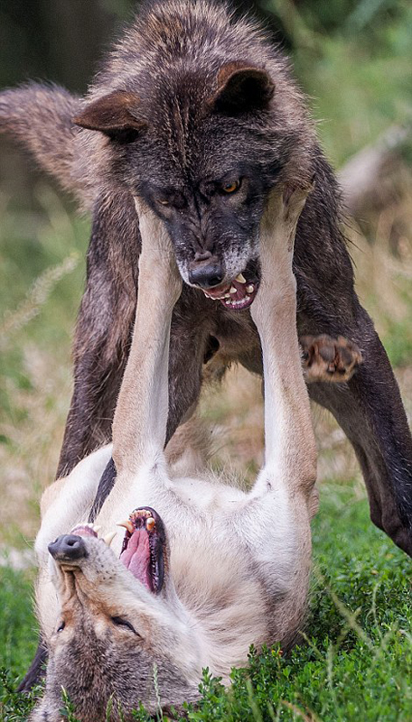 近日,德国摄影师英戈 格拉赫在该国巴伐利亚的野生动物园中拍摄到了残暴的一幕。一只黑色大灰狼为争夺王位而咆哮攻击另一只弱小灰狼,场面震撼。