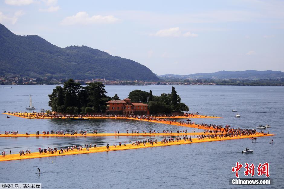 近日,意大利尹塞奥湖 (Lake Iseo)上,金灿灿的“浮动码头”上周六(6月18日)首次免费对公众开放,上万名游客蜂拥而至登上了“码头”体验水上漫步。
