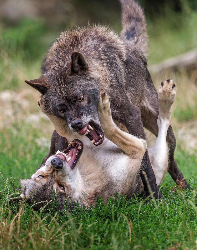 凶狠的目光、锋利的牙齿、高声的咆哮,这只充满攻击性黑色的大灰狼将另一只灰狼狠狠地按在地上,不给它一点逃跑的余地。63岁的英戈恰好拍摄到了两狼王位之争的画面。弱小的灰狼大概知道自己必输无疑,为了减轻伤害,便不断向黑狼摇尾巴示弱。