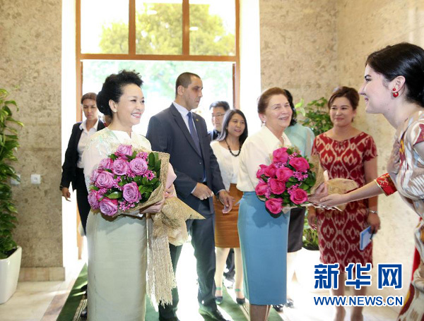 彭丽媛同乌兹别克斯坦总统夫人卡里莫娃共同参观塔什干孔子学院