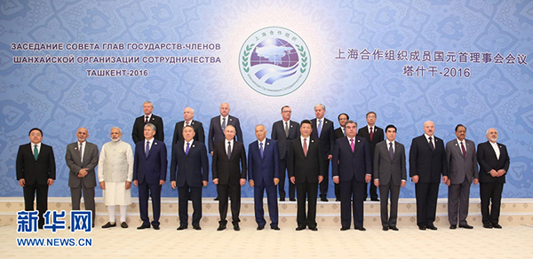 6月24日,国家主席习近平在乌兹别克斯坦塔什干出席上海合作组织成员国元首理事会第十六次会议并发表重要讲话。这是大范围会谈开始前,习近平同哈萨克斯坦总统纳扎尔巴耶夫、吉尔吉斯斯坦总统阿坦巴耶夫、俄罗斯总统普京、塔吉克斯坦总统拉赫蒙、乌兹别克斯坦总统卡里莫夫,观察员国阿富汗总统加尼、白俄罗斯总统卢卡申科、印度总理莫迪、蒙古国总统额勒贝格道尔吉、巴基斯坦总统侯赛因、伊朗外交部长扎里夫,主席国客人土库曼斯坦总统别尔德穆哈梅多夫以及有关国际和地区组织代表集体合影。新华社记者 丁林 摄