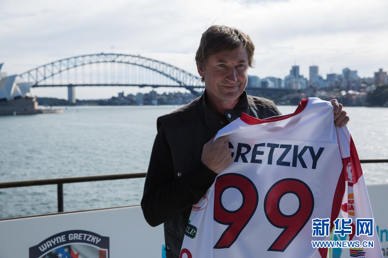 6月23日,冰球传奇人物韦恩·格雷茨基展示将在表演赛中的战袍。当日,冰球传奇人物韦恩·格雷茨基在澳大利亚悉尼进行冬季运动的推广。他将在冰球表演赛中以北美职业冰球联赛退役球员的身份亮相。现年55岁的加拿大冰球传奇人物、被称为“史上最佳”的韦恩·格雷茨基将重新披挂上阵,为6月25日即将在悉尼上演的美国与加拿大的冰球赛预热。新华网发(朱宏业摄)