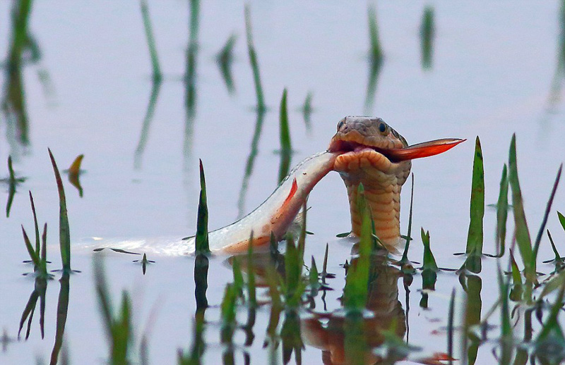据英国《每日邮报》6月22日报道,印度51岁老人钱德拉 谢卡尔 斯希鲁尔日前在该国索梅斯赫瓦尔湖拍摄到有趣一幕,一条渔游蛇在水中成功捕获了一条鱼。