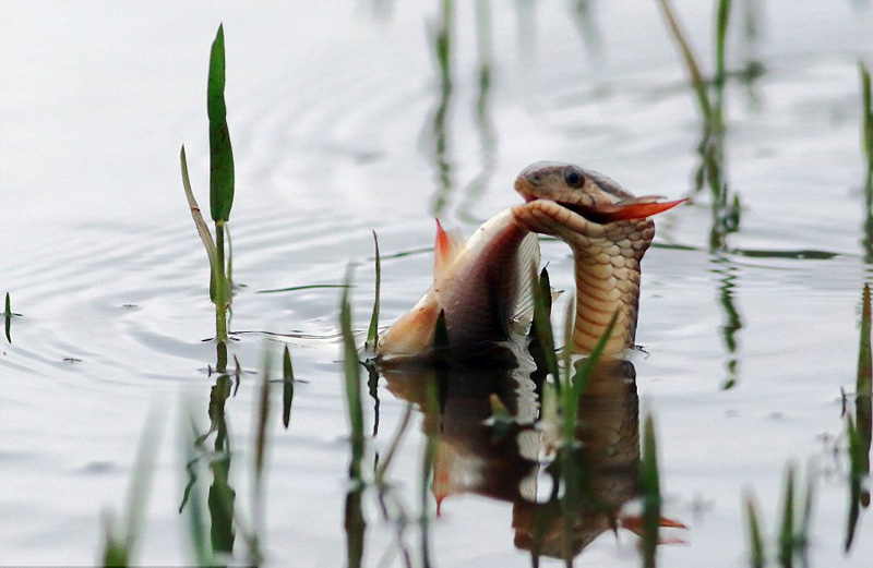 照片中,渔游蛇嘴里紧紧叼着鱼尾巴,大方向人们展示着它的战利品。