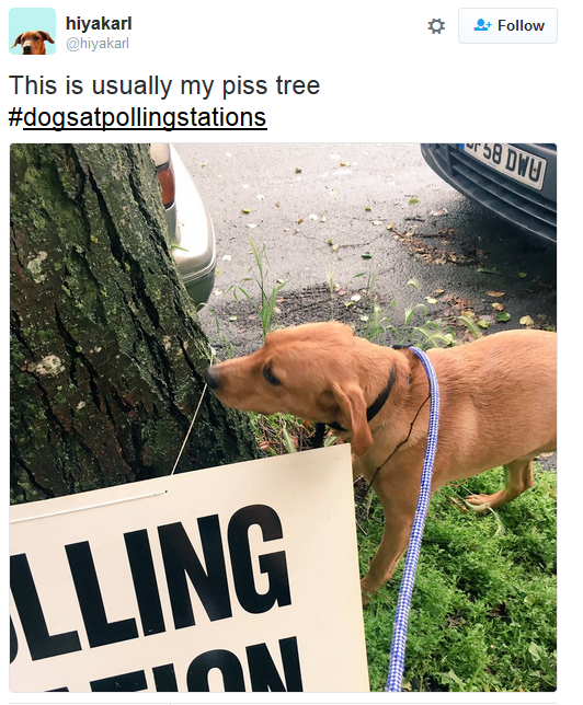 据英国广播公司(BBC)当地时间6月23日报道,决定英国是否留在欧盟的脱欧公投已经开始,相比各国政要及媒体紧张地等待结果,英国投票民众倒显得很轻松。在社交网站Twitter和Instagram上,热词#dogsatpollingstations(狗狗在投票站)的推文内容中,各种各样的狗狗被主人“停”在投票站外门口的照片数不胜数,堪称“花式秀狗”。这是我留过记号的地方。记者 周骥滢