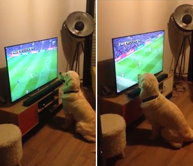 据英国《每日邮报》6月22日报道,近日,一段搞笑视频在YouTube上迅速走红。画面中,一只金毛犬坐在电视机前观看欧洲杯法国队的比赛,有模有样,甚至跟着足球来回走动,看得十分投入,真是名副其实的“头号球迷”,令人捧腹。