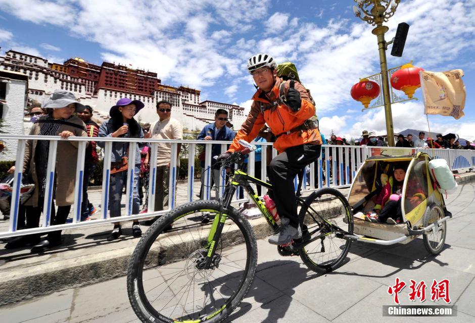 2016年5月14日,齐海亮载着女儿齐六一从拉萨市布达拉宫经过。34岁的齐海亮是一位古典音乐老师,2015年9月,他带着女儿从家乡河北省唐山市出发,骑着经他改装过的自行车+拖车的组合,开始了他们环游中国的旅行。旅行的8个多月里,他们途经天津、山东、安徽、江苏等10个省市区,骑行了1.3万多公里。“下一站是新疆。”齐海亮说,他还要用一年的时间载着女儿完成环游中国的计划,“我想带她看看我们的祖国有多大,让她近距离地感受大自然,用我自己的方式陪着她长大。”中新社记者 李林 摄