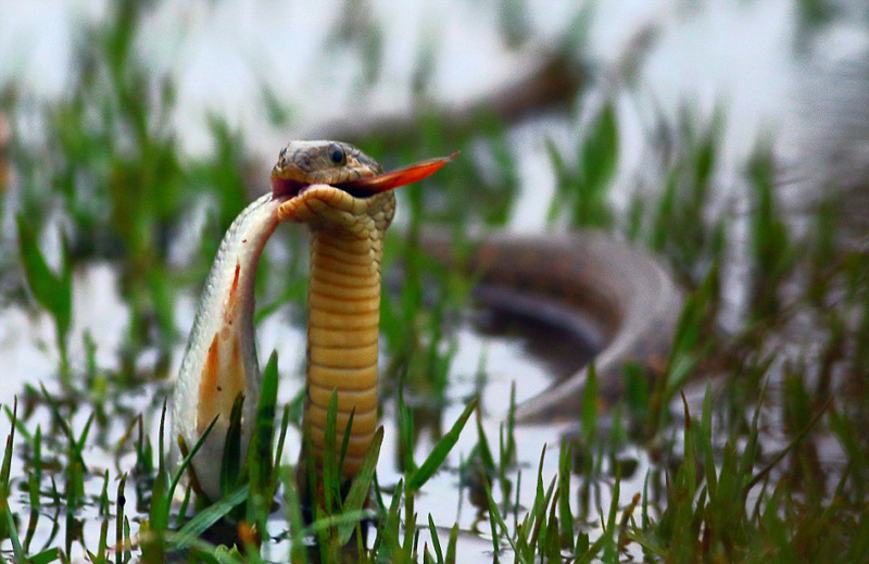 照片中,渔游蛇嘴里紧紧叼着鱼尾巴,大方向人们展示着它的战利品。