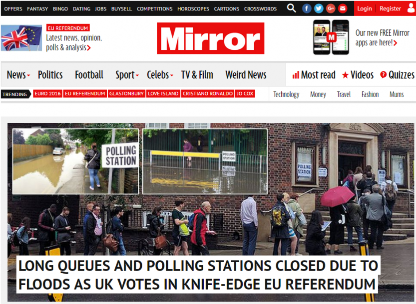 英国《镜报》:投票站排起长队,由于洪水原因投票站关闭。