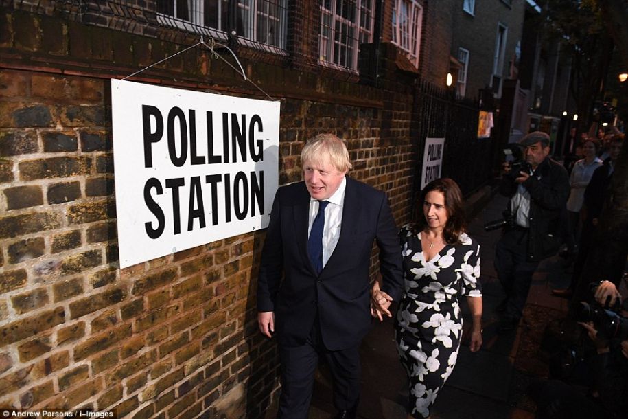 前伦敦市长鲍里斯·约翰逊与妻子前往伦敦投票站投票。