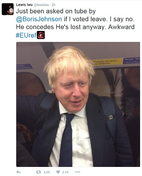 一个网友在地铁上遇见鲍里斯,随后发布推特表示鲍里斯问我你是否投了脱欧的票,我说没有。他表示无论怎样输了,真尴尬。