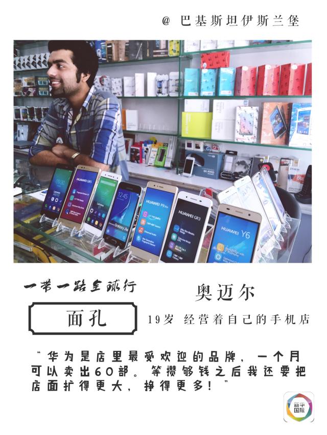 遇到奥迈尔,19岁的脸上满是朝气。他在巴基斯坦首都伊斯兰堡的闹市区经营一家手机店,十几平方米的小店前后分成零售和维修两个区,连他自己一共仨人员。除去500美元的月租,一个月还能收入1500美元。奥迈尔指着柜台上成排的华为手机模型,告诉我们,中国手机在这里十分受欢迎。