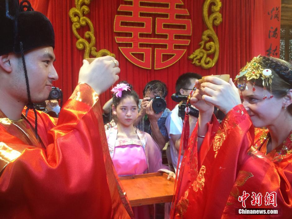 6月24日,新郎牛祯与乌克兰新娘玛丽饮合卺酒,喝完第一口时,两人将杯子高举到眉间,寓意举案齐眉。当日,浙江武义俞源村举办中式集体婚礼,现场张灯结彩,喜气洋洋。中新社记者 奚金燕 摄