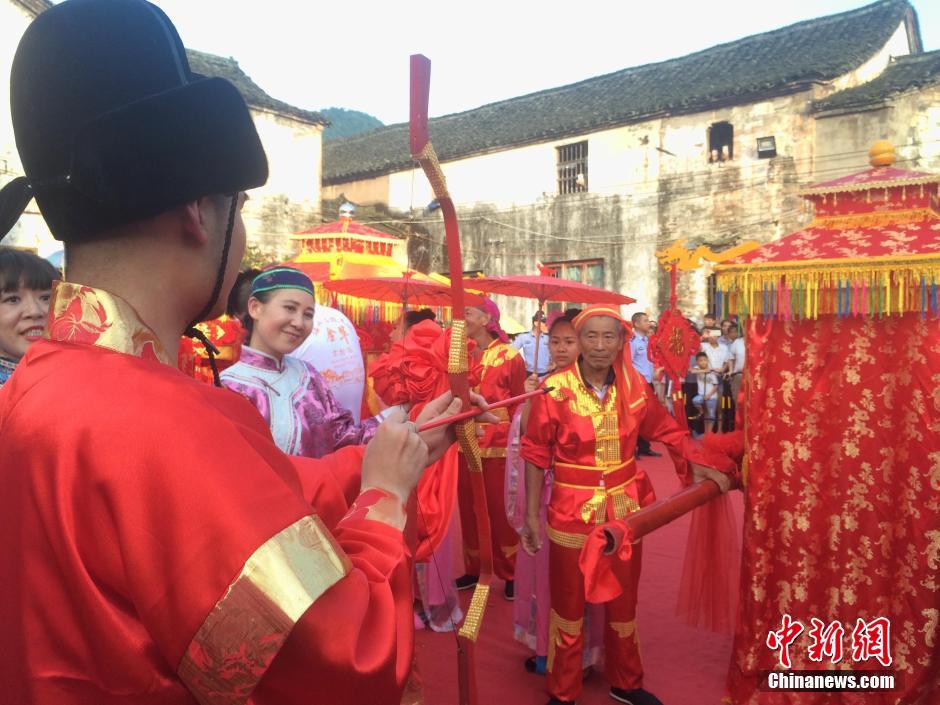 6月24日,新郎牛祯正在向喜轿射箭,喜轿里面坐着他的乌克兰新娘玛丽。按照中国传统婚俗,落轿后,新郎要三箭定乾坤,一射天,天作之合;二射地,地久天长;三箭定乾坤富贵喜迎门。当日,浙江武义俞源村举办中式集体婚礼,现场张灯结彩,喜气洋洋。中新社记者 奚金燕 摄