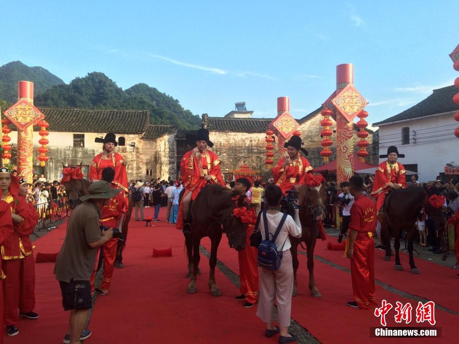 6月24日,浙江武义俞源村举办中式集体婚礼,现场张灯结彩,喜气洋洋,新郎们正骑着高头大马迎亲,其中有不少是“洋面孔”。中新社记者 奚金燕 摄