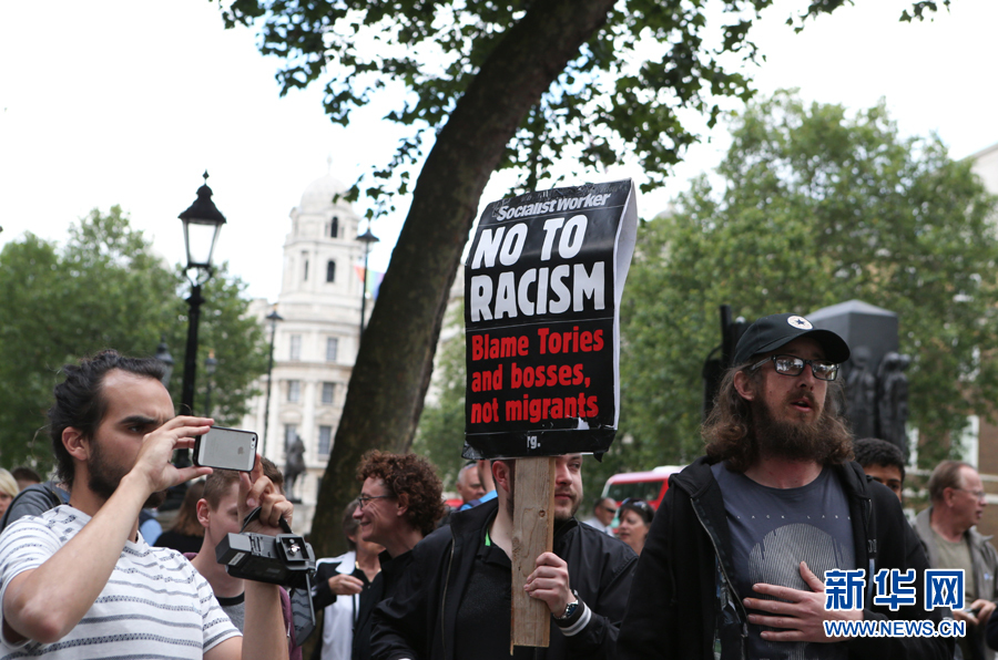 6月26日,在英国伦敦,一部分抗议者手举标语牌抗议“