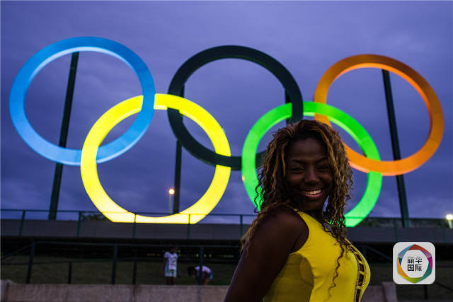 图为2015年7月1日,一名女子在里约热内卢马杜雷拉公园与奥运五环合影。新华社发
