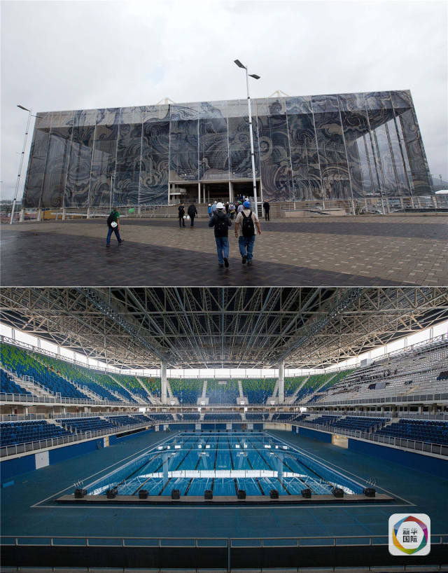 拼版照片显示的是2016年5月19日拍摄的里约市内的奥林匹克水上体育馆外景(上)和内景(下)。新华社发