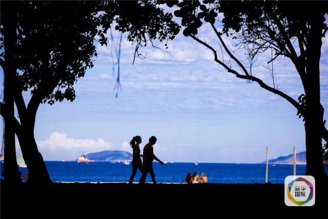 图为2014年4月21日,两名市民在里约东部的弗拉门戈海滩的步道上散步。新华社记者徐子鉴摄