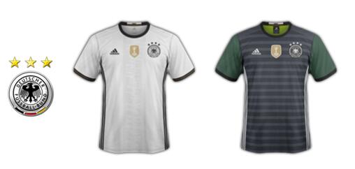 德国队的赞助商依然是Adidas。主场队服款式比较传统,白色为主色,加黑色点缀。客场球服是墨绿色袖子加黑灰条纹的设计,更加凸显出了队徽上那闪耀夺目的四颗金色星星。